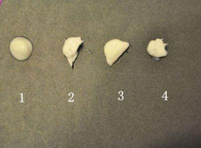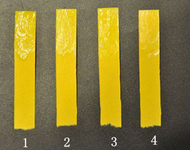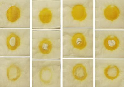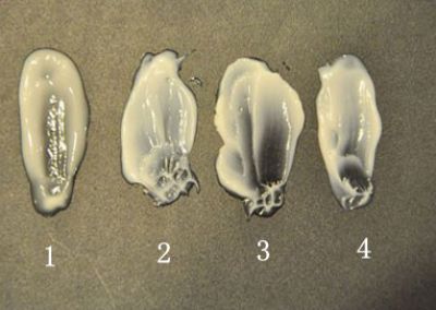 对于抗老作为诉求的面霜,最重要的就是其抗氧化的能力。将化妆棉蘸去稀释后的碘酒,在中心分别涂抹四款面霜,看其恢复本来颜色的效果。若颜色恢复迅速且与化妆棉颜色相近或相同,则证明抗氧化成分有效。反之则不尽理想。