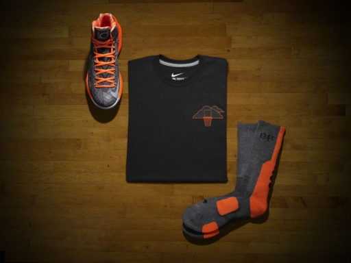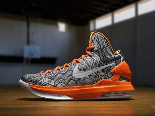 在今天正式发布的2013 “BHM”系列篮球鞋上,看到了KB8 System、Lebron X、KD V三个市售鞋款,均以黑/灰的几何花纹搭配橙色的点缀构成鞋身,是去年黑色配民族花纹的“BHM”系列的一个延续,同时个人认为在设计上今年更为出色。