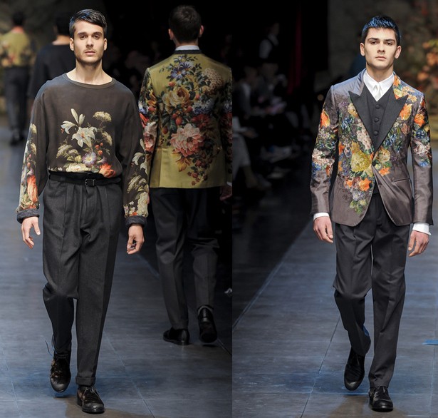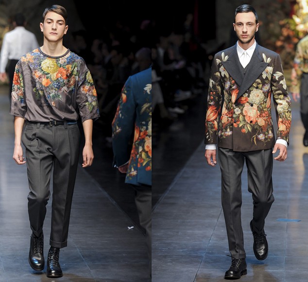 而杜嘉班纳 (Dolce&Gabbana) 著名的西装设计,则走起相当华丽的路线,刺绣或印花的方式呈现大片华丽的花卉图案,堪比女装秀的绚丽程度。正整场大秀徘徊在华丽服饰与亲切民族装束之间,感受着双重风格的不断切换。