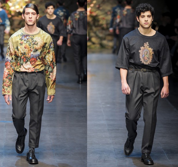 杜嘉班纳 (Dolce&Gabbana) 2013秋冬男装系列的主题是“Devotion ”,带着强烈的宗教意味,无论是秀场布景中摆放的圣母像,还是衣衫上绘制的宗教画像、唱诗班图案,都让整个秀场笼罩在神圣感与淳朴民风交织的氛围中。阔袖府绸上衣成为本次杜嘉班纳 (Dolce&Gabbana) 秀场上的主打款式之一,宽松舒适的轮廓,富有垂坠感的质地,随意卷起的袖口,看起来更为率性潇洒。但可能从模特到服饰都保持着原汁原味的西西里风情,让小编不自觉地感到T台上走来了一群西西里牧羊童。