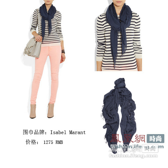 Isabel Marant的这条围巾简单大方,展现自然、舒适、洒脱的气质,搭配条纹上衣与粉色瘦腿裤给人轻松甜美的惬意感,给上班生活注入一股年轻的活力。