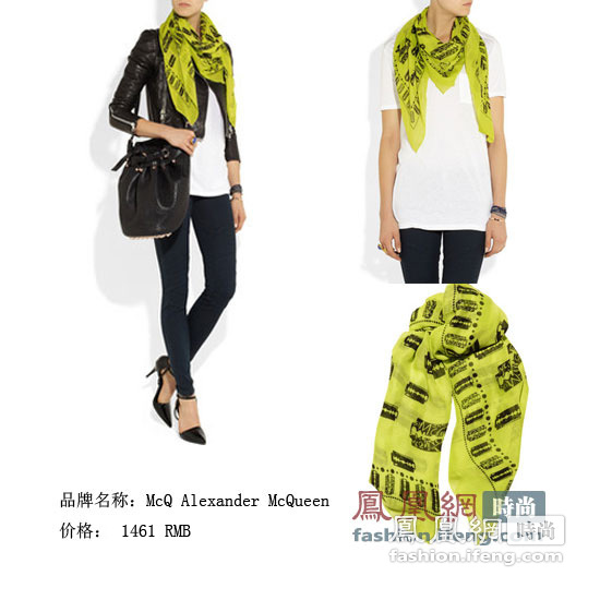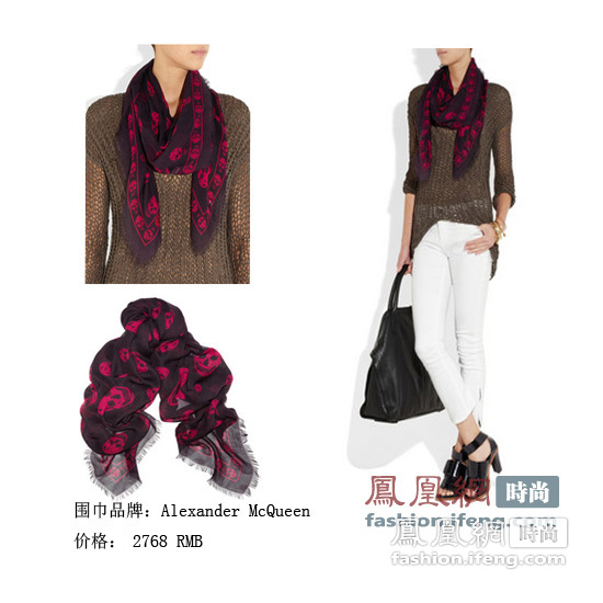 这款Alexander McQueen的围巾是今年潮流必备品之一,McQueen的御用图形红色骷髅头黑底丝质设计酷感十足,沿袭了个性、狂野的品牌风格,搭配休闲宽松针织衫和白色瘦腿裤营造游刃有余的职场魅力。