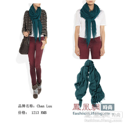 Chan luu设计每一件作品都有关于大自然和文化的故事,偏爱传统古老的工艺,成为今年好莱坞名人大爱的品牌之一。这款Chanluu的绿色围巾宽大柔软,穗状细节让休闲搭配更显自然流畅。