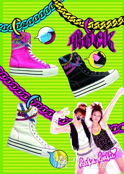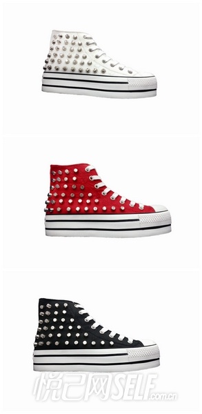 此外,Rabu Rabu还推出了可翻折两穿的高帮厚底鞋,鞋身特别设计胶印锁链图案,增添了一丝摇滚的感觉。如果你是“色彩控”,或者钟爱摇滚范儿十足的铆钉元素,相信Rabu Rabu一定有一款与你对味!