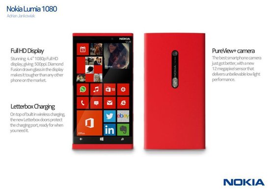 Lumia 1080概念机搭配了4.4英寸分辨率为1080p的高清屏幕,1200万像素的PureView镜头。这款手机支持无线充电、配有充电保护端口。另外设计师还理想化的为其配备了四核处理器以及2GB RAM(目前的WP8平台最高为双核+1GB RAM),希望在未来我们可以看到这款概念机成真。