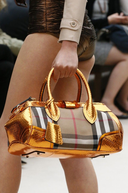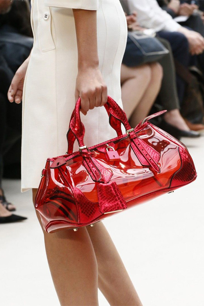 Burberry 2013春夏系列包包颠覆了以往的中规中矩,将强烈的金属质感与甜美的糖果色系融合在一起,仿佛刚从糖果盒里取出的色彩缤纷的糖果一般,透明材质和渐变色的设计更显前卫与时髦。