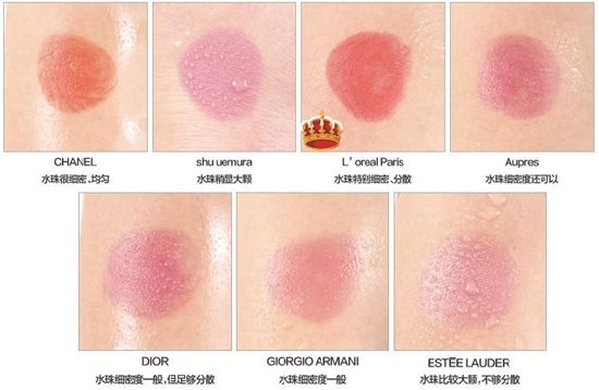 先将唇膏涂抹在手背上,晾两分钟后,用喷雾将水珠均匀地喷在干了的颜色上,观察水珠的散开状况。水珠分布越细密、越分散,说明唇膏的蜡质成分适中,保湿和防水两方面的素质结合得很好。水珠变大颗,说明唇膏里的某些成分溶于水造成水珠串联或下流。