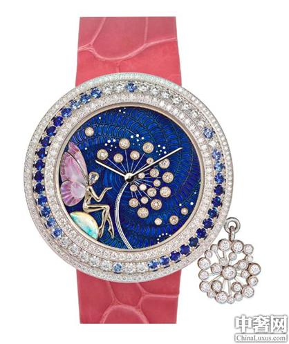 螺旋图案的表盘是以剔透蓝色亮漆散发眩目活力。蝶翅仙子以黄金微雕而成,脸部采用是一颗玫瑰形切割钻石镶嵌,珐琅翅膀色泽迷人,而蒲公英以风中飘扬的钻石镶嵌而成。