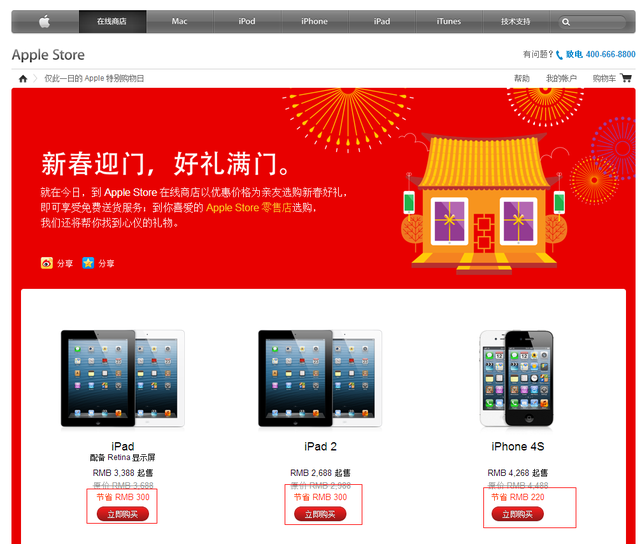 2013年1月25日,苹果中国在其官方在线商城举行首次红色星期五促销活动,促销涉及iPad、iPhone 4S、iPod和MacBook多条产品线和很多配件产品。其中iPhone 4S降价220元至4268元,iPad 3代降至3388元,包括Retina屏幕的MacBook笔记本产品全线降价700元。但此次促销的产品并不包括最新的iPhone 5手机和刚刚上市的iPad mini以及第四代iPad。