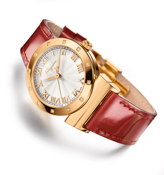 Grande Masion情人节特别款搭配Gancino造型IP离子镀金表壳、镶嵌12颗钻石的表圈和瑞士原产石英机芯、纽索饰纹银色表盘、罗马数字时标和柔软的红色皮革表带,无不彰显出极致优雅的迷人魅力。红色不仅代表着无尽的渴望,也是Ferragamo的标志性颜色。Grande Masion情人节特别款完美的融合精良的瑞士制表工艺和独特精致的设计风格,无疑是不可多得的时计珍品