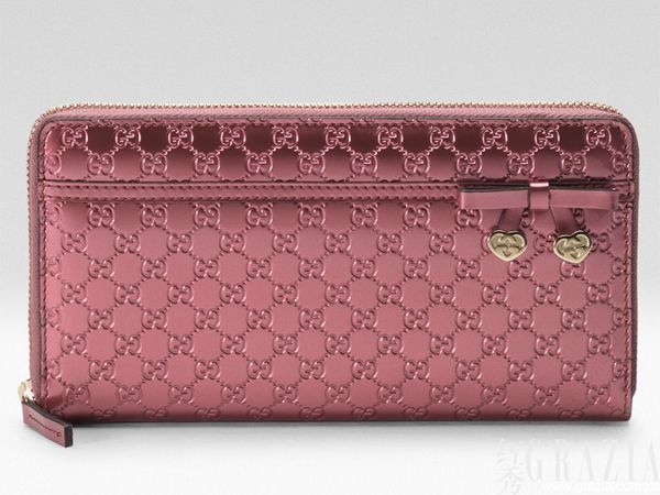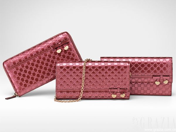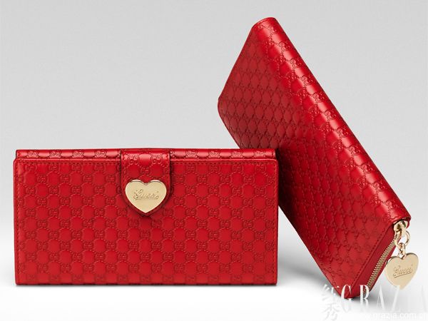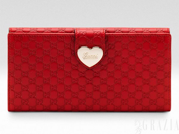 钱夹拥有不同心形造型搭配不同皮革材质供选择,单颗金属质搭扣印有手写体的“Gucci”字样,搭配大红色牛皮Guccissima印花,富有文艺气息。