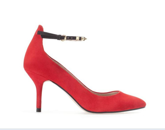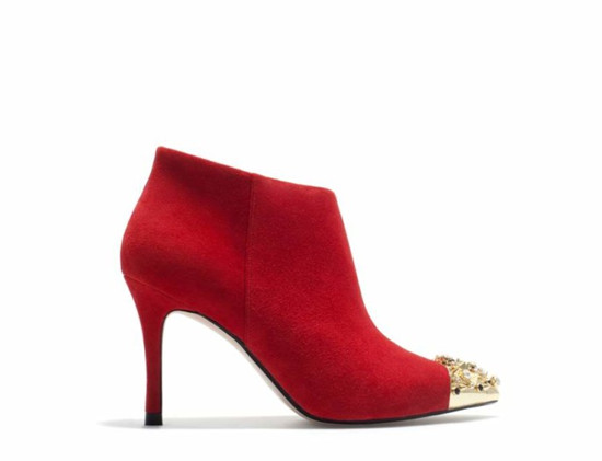 ZARA红色及踝靴,鞋头的金色铆钉和鞋子本身的红色相得映彰,高雅时尚!