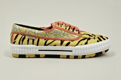 近年再度于国际时装界活跃起来的法国品牌 Kenzo 在今个春夏带来全新的 Helios Plimsoll 鞋款,在去年与 Vans 合作的鞋款系列后,全新春夏吸取了以往的经验打造,外型采用独特的鞋款设计,结合了帆船鞋以及 Vans Era 的经典设计 鞋面主要以质料坚韧的帆布打造,上面同时铺上大片的动物纹图案,这也是 Kenzo 近期火热的主打设计,令鞋款有着丰富的视觉效果。此外,Helios Plimsoll 亦比一般的平底鞋多了一层橙色的橡胶鞋底,令鞋款整体的质感有所提升。除了以上以黄色作为主调之外,设计师亦为鞋款增添了一个蓝色造型,上面布满色彩缤粉的豹纹,散发着浓厚的森林气息。