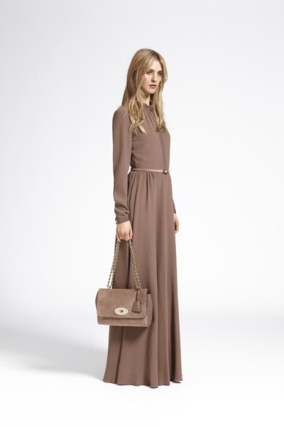 主要轮廓在70年代线条与剪裁方法的基础上以Mulberry的风格重新塑造,传统的穿衣层次:在夏季裙装外裹上外套,使奢华的织物面料与英式的淡然味道形成对比,穿梭整个系列中。中长大衣、丝质滚边的T恤及加有皮质元素的夹克与裙子为俏皮的剪裁增添了古典的高雅。牛仔布在复古休闲的服饰中也扮演了重要的角色。Mulberry的金属配件突显了优雅而奢华的细节:桑树商标、淡金色扣、拉链、钮扣以及与皮革、丝绸、天鹅绒和绉纱等织物以直条和修边方式,拼凑成不同的对比组合。