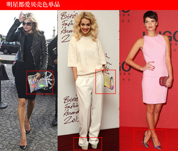 早前名模凯特·莫斯(Kate Moss)被发现手拿Stella McCartney的手包出席某酒店开业庆典。随后瑞塔·欧拉(Rita Ora)穿了贝壳色高跟鞋搭配同色手包。上周皮格茜· 盖尔多夫(Pixie Geldof)也是穿着贝壳色高跟鞋出席HUGO BOSS某活动。贝壳色单品让时尚指数直线飙升。
