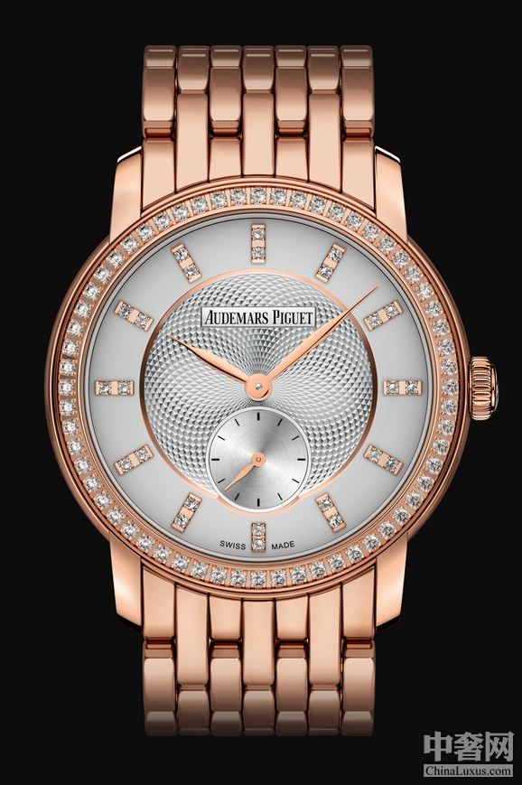 表盘:浅银色表盘,格状饰纹装饰,玫瑰金镶钻立体时标和指针。
