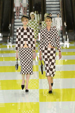 纵观整个系列,对比概念贯穿其中:以棋盘格图案为素材,每一件长裙都凸显出双色对比,亮面与哑光的对比,虚实有无的对比;模特二人组并肩出场的方式更是增强了对比意味。品牌艺术总监Marc Jacobs 构思这一系列时,从截然不同的两位六十年代法国缪斯Francoise Hardy ,以及Jane Birkin 的形象得到启发:Francoise Hardy 衣着保守密实,Jane Birkin 性感开放,而两者皆钟情于简洁修长的线条。