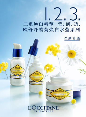 2013年,L’OCCITANE欧舒丹延续法国普罗旺斯的养肤传统与护肤科技,在经典明星蜡菊美白配方的基础上,研制出全新升级欧舒丹蜡菊焕白水莹系列:优选源于科西嘉岛恢复年轻活力的两大植物精华——润透修护的蜡菊及亮白水凝的雏菊,更突破性注入全新光感透白因子——金莲花,三重植物焕白精萃,令肌肤美白修复力倍增,重新调和肌肤对光与影的折射,焕发出令人怦然心动的莹。润。透感白!