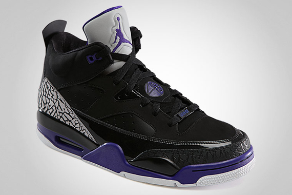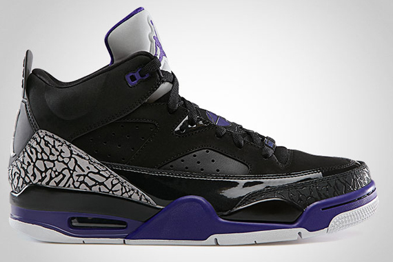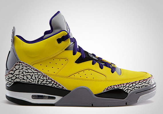 在 2013 Jordan Son of Mars Low 终于释出,并将在4月发售,这双 Jordan Son of Mars Low 依然由 Spiz’ike 来设计结合了 Air Jordan 最经典的 Air Jordan IV 的鞋底, Air Jordan III 的爆裂纹, Air Jordan V 的反光鞋舌 和 Air Jordan VI 的鞋身, 现在有两个配色, 当中有Lakers 湖人队配色 紫 X 黄, 另一个配色是 黑 X紫。