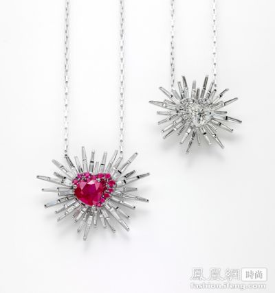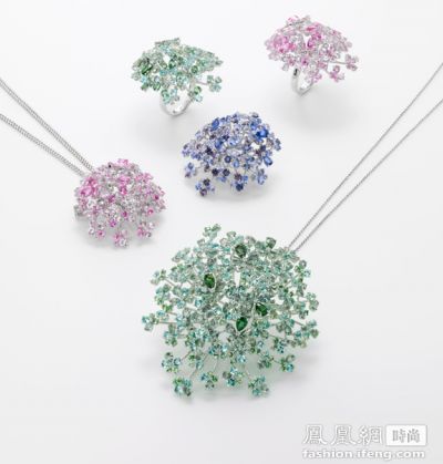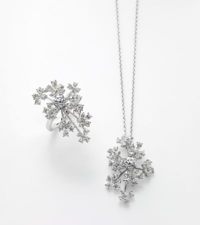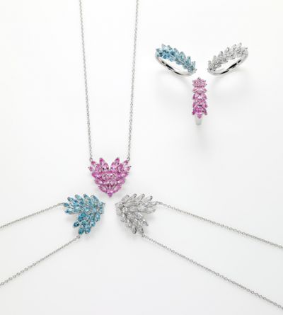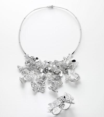 Aflutter漫天飞舞 项链:钻石(11.82克拉),18K白金;戒指:钻石(0.97克拉),18K白金。大群美丽的蝴蝶的围绕着锦簇的花丛飞舞,震颤着如丝绸锻造的翅膀,奇异而又美丽的幻境,将蝴蝶召唤到这个神秘的世界!纯粹而又闪耀的钻石,被某种神秘的心情赋予了应有的色彩!