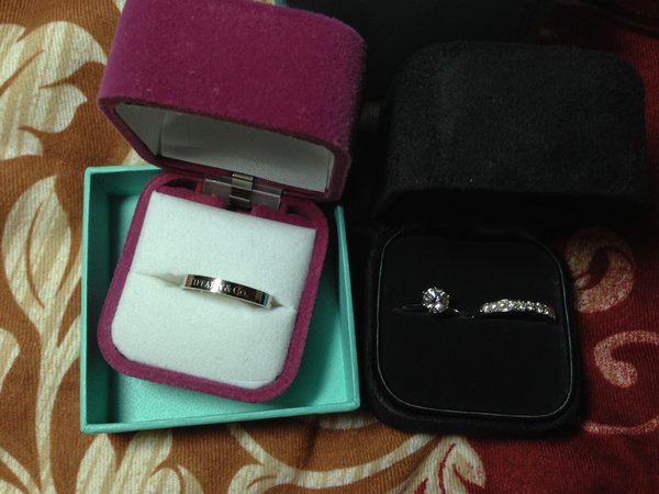 tiffany说没有戒指盒,右边的还是后来我去换戒指的时候要来的,也说没货了只给了我一个,去换戒指时因为行李已经整理好,只能把戒指戴手上去换,结果说我带过来不给换(戒指尺寸大了)。
