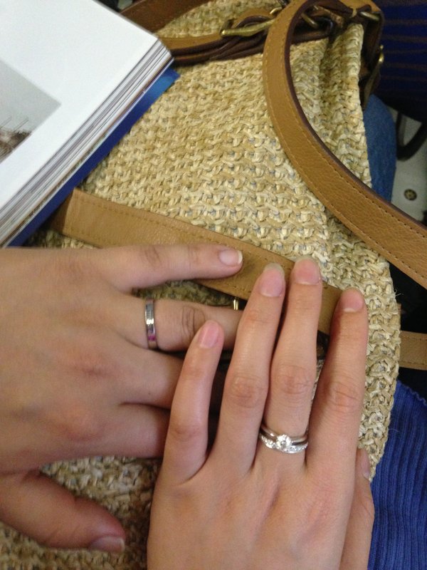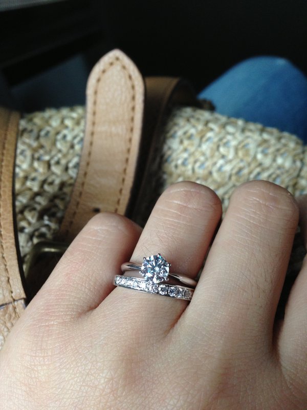 blue家的钻戒(73分,E,VS1,3EX,NONE)和tiffiany家的对戒,一起戴还蛮好看的。不过如果要我再选择我会选三钻的可有logo的那款女戒。我买的这款是23900港币,三钻那款记得好像是16800港币。