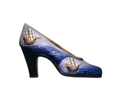 Salvatore Ferragamo 方头帆布高跟鞋,饰以船形图案,1930 – 1935 年。
