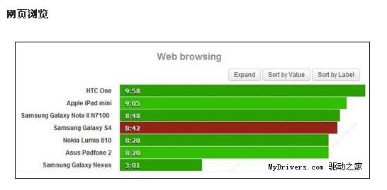 目前的网页主要以白色为背景,对于自发光的AMOLED屏幕来说,白色显示是尤为费电的,但Galaxy S4还是坚持了8小时42分钟,和Note 2差不多。