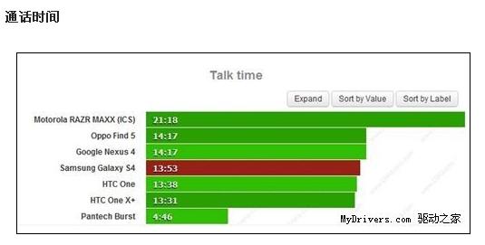 该测试是在关闭屏幕的状态下进行的,最终Galaxy S4可以坚持接近14个小时的时间,和采用相同处理器的HTC One战成平手,不过落后于Nexus 4以及OPPO Find 5等设备。