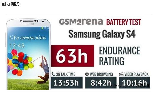 耐力测试方面,如果你每天通话、网页浏览和看视频各1小时,预计Galaxy S4能坚持63个小时,但对大部分用户来说Galaxy S4还是摆脱不了一天一充电的局面的。