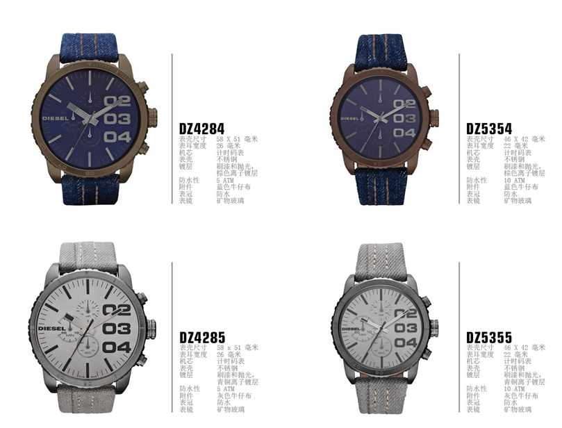 Denimize系列有两种颜色,同时宣扬了厚重的牛仔布历史和Diesel大胆前卫的腕表设计风格。DZ4285和DZ5355款式酷爽的灰色牛仔布和黑色的真皮搭配青铜色调表壳和表盘细节,凸显了时尚但随意的日常风格。而DZ4284和DZ5354款式深蓝色牛仔布和棕色真皮搭配棕色色调表壳和表盘细节则让您深切地体会到了Diesel毋庸置疑的时尚美学。两款颜色搭配同时提供51毫米男式腕表表壳以及与之搭配的42毫米女士表壳,仅仅修饰有细微不同。所有时计都拥有超大尺寸的“2”、“3”和“4”的小时时标,该亮点是Diesel标志性的修饰风格。无论您选择哪款腕表,Diesel Denim限量版腕表系列将为“过去与现在相融”的时尚风格树立新的标准。