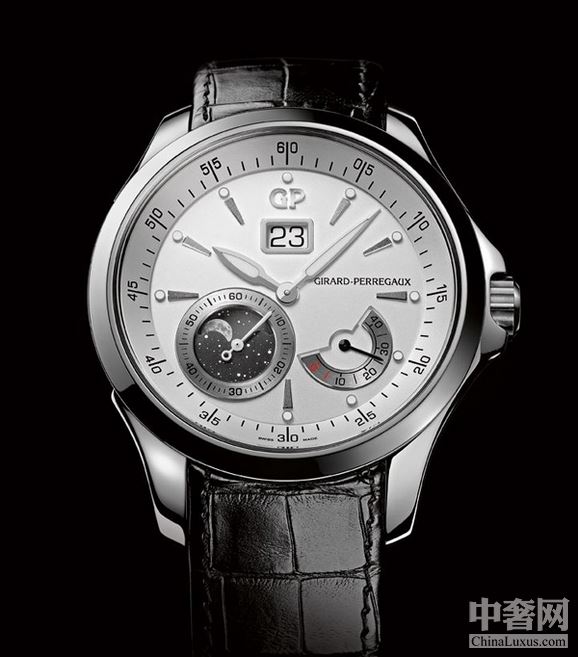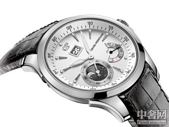 微拱形乳白面表盘设计令时间显示更突出,斜面分钟刻度加添深度层次感,人手镶饰夜光时标指向中央,令视线聚焦于各个功能显示;各项功能由GP芝柏表自制GP03300自动机芯驱动,时针及分针经夜光处理,12时位GP标志下面有大日历窗,7时半位月相连小秒针,4时半为动力储备显示,功能各司其职,创新布局平衡有致,优雅地显示时间的推移。
