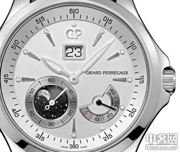 机芯其中一项创新设计,是将月相及动力储备显示直接连系于发条鼓,令月相转碟精确运行不息,精确至122年只误差一天,而月相调效掣位于10位表壳侧;月相设计非常像真,矿物玻璃物料经金属化处理,造出黑至灰色渐变效果,月球表面活灵活现,银星闪闪如同银河星宿,其中一颗星暗藏GP标志;月相外围磨砂圆框有秒钟刻度。