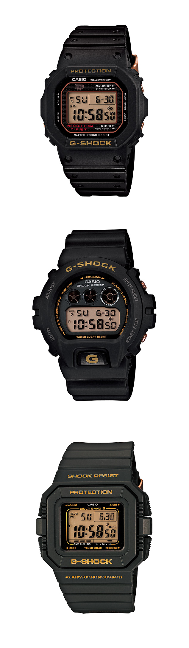 G Shock 为了纪念 30 週年推出 黑金色限定系列錶款,这个以G-Shock 三个不同时代中最受欢迎的錶款,作為三十週年系列 GW 5530C, DW6930C 和 DW 5030C , 三款以全黑色的錶身再加上金色未字样来呈现。