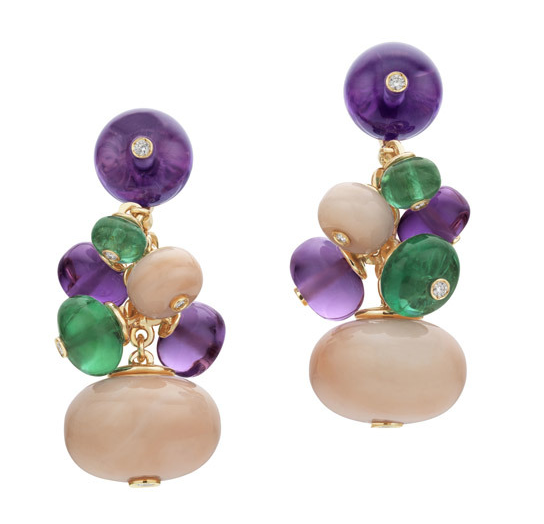 BVLGARI宝格丽顶级珠宝系列玫瑰金耳环镶嵌6颗圆形切割祖母绿(7.08克拉),6颗圆形切割紫水晶(13.56克拉),4颗圆形切割珊瑚和密镶钻石(0.19克拉)。