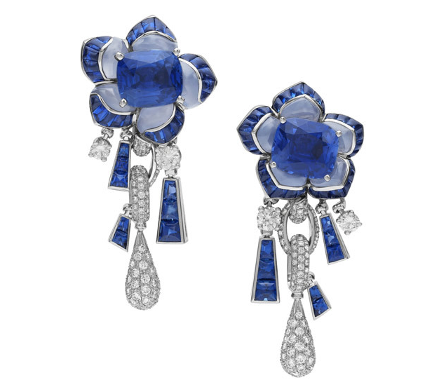 BVLGARI宝格丽顶级珠宝系列白金玉髓耳环镶嵌2颗蓝宝石(9.84克拉),梯形切割蓝宝石(6.43克拉)和钻石(4.93克拉)。