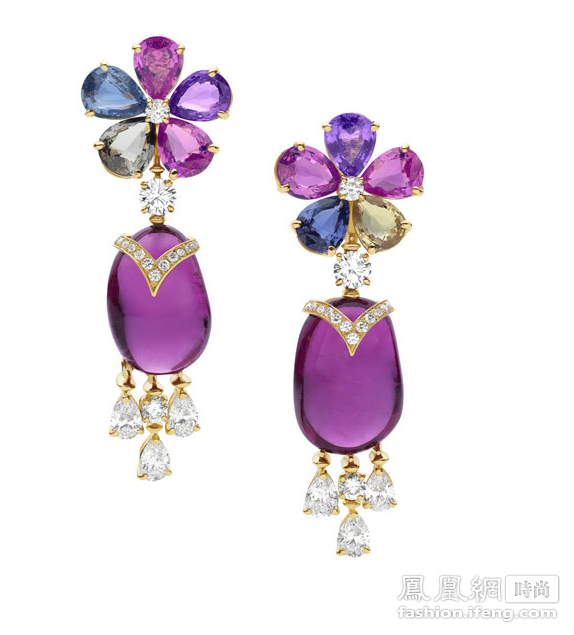 BVLGARI宝格丽顶级珠宝系列黄金耳环镶嵌2颗红碧玺(37.50克拉),10颗梨形艳彩蓝宝石(14.36克拉), 6颗明亮式切割钻石(2.56克拉),6颗圆形明亮式切割钻石(1.59克拉)。