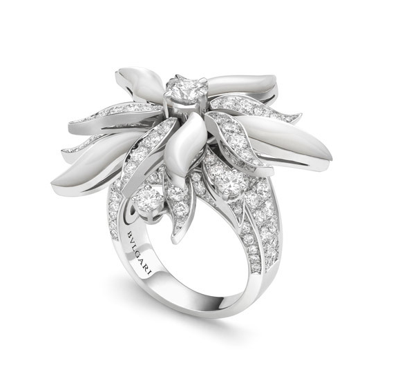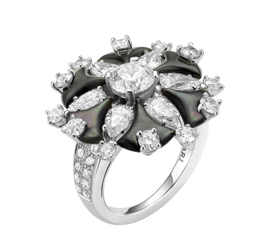 BVLGARI宝格丽顶级珠宝系列白金珍珠贝母戒指镶嵌1颗圆形明亮式切割钻石(1.00克拉),6颗梨形钻石(1.70克拉)和12颗圆形明亮式切割钻石(1.62克拉)。