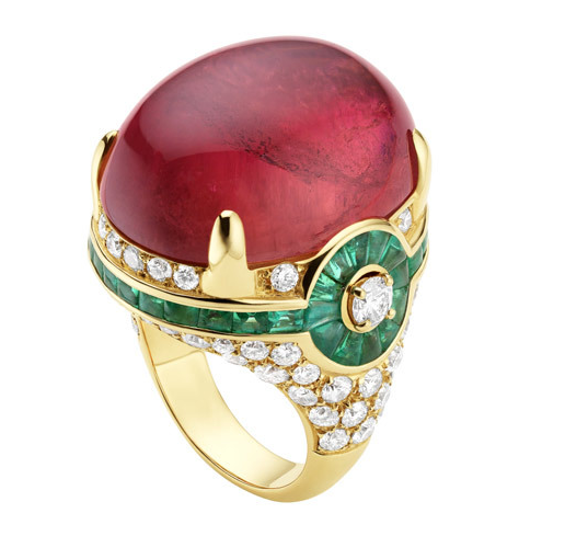 BVLGARI宝格丽顶级珠宝系列黄金戒指镶嵌1颗粉碧玺(2.36克拉),40颗祖母绿和2颗圆形明亮式切割钻石与密镶钻石(2.85克拉)。