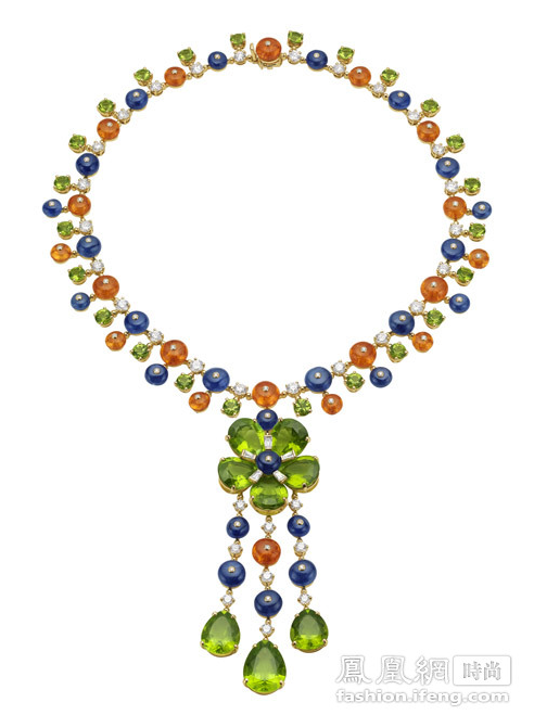 BVLGARI宝格丽顶级珠宝系列黄金项链镶嵌32颗橄榄石(80.62克拉),25颗蓝宝石(82.97克拉)、19颗石榴石(68.25克拉)和钻石(11.01克拉)