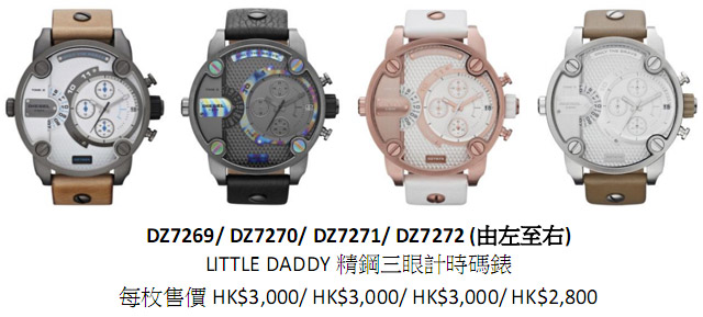 Diesel 今季另一款腕錶系列亦再次触动全城,最新 LITTLE DADDY 系列推出一共四款以特大设计掛帅的腕錶,錶壳直径达 61 毫米,并饰有金字塔纹理的錶盘,突显超大錶面的精髓。此外,更齐集三圈计时、电子时间显示及三指针机芯功能於一身,绝对是强势的完美典范。