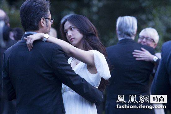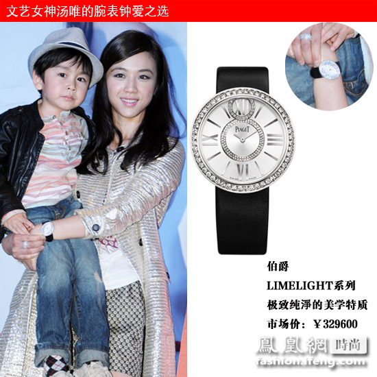 在发布会上,汤唯身穿一身银色风衣,搭配了这款来自于伯爵LIMELIGHT系列女士腕表。这款表极致纯淨的美学特质让人一见倾心,黑色的表带柔中带钢, 凸显汤唯特有的文艺气质。表盘上的美钻十分耀眼,看来钻石是女神必备元素。