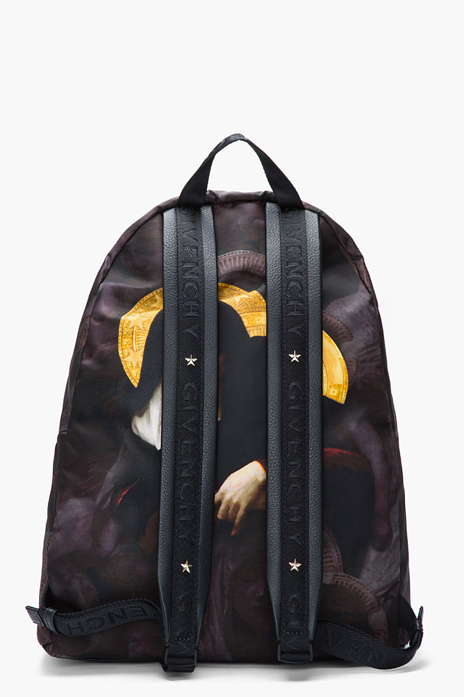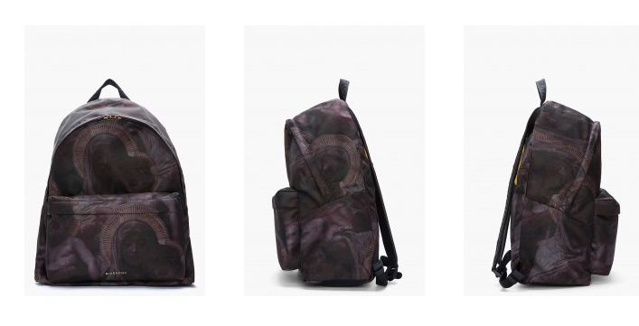 其中一款也是和宗教题材相关联,棕色的皮革构造出简约的包身,前面隐隐约约有圣母和耶稣的班花,但背面却旗帜鲜明地印着一双拥吻的情侣,爱情万岁的主题跃然而出。背带上还有Givenchy标志性的星星的图案,定价$1,135美元(约$8,812港元)。