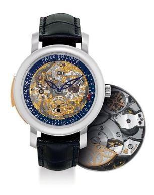 采用铂金和18K粉红金表壳、半镂空表盘的三问万年历腕表,型号为5104