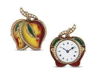系列蕴含了多款水果、乐器或昆虫等形状设计的精致珐琅钟表,并以珐琅、珍珠或钻石装饰,表现了表匠熟练的制表技巧,亦结合了珐琅匠鬼斧神工的修饰工艺。系列的亮点包括三款约1810年于瑞士生产的锁匙上链时计,分别为专为中国市场而设的双桃形时计(见图,拍品编号2660,估价:62,000-80,000港元/8,000-10,000美元)、郁金香形时计(拍品编号2671,估价:120,000-180,000/15,000-22,000),以及蝴蝶形时计(见图,拍品编号2819,估价:120,000-180,000/15,000-23,000)。