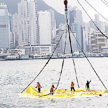 工作人员系上多条缆索,再由趸船吊起,但由于部分“鸭皮”载住海水,故要用水泵先排走海水,再将“鸭皮”吊上岸。来源:香港《明报》