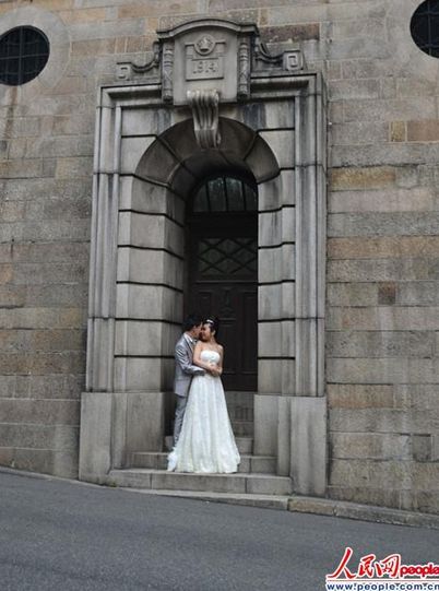一对新婚夫妇在旧中区警署的门口拍婚纱照。