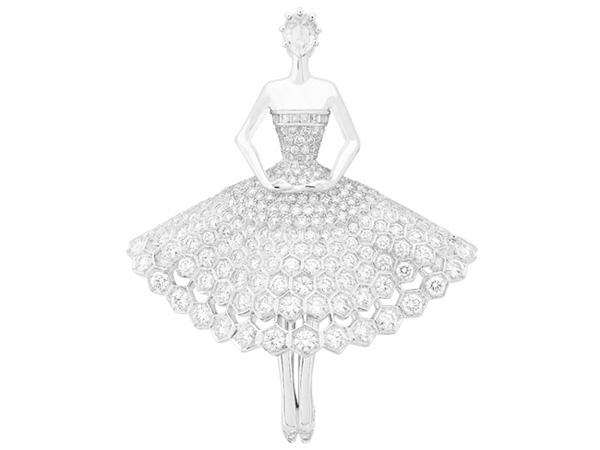 为纪念这次合作计划,梵克雅宝再度取材于世家珍爱的传统创作主题,呈献三款设计独一无二的芭蕾舞小仙子胸针。三位芭蕾舞者均以一身白金和钻石亮相,耀目璀璨,展现脱俗高雅风采。其中一位芭蕾舞者穿着飘逸灵秀的舞裙,优雅地站立台上,裙上细致的蜂巢图案钻饰绽放万丈光芒。另外两位舞者则在台上翩翩起舞,并将空中飞跃的优雅身影凝炼为瑰丽的胸针,恒久保存。梵克雅宝再次借着纤细精致的舞姿,以白金和宝石演绎脱俗的动感。