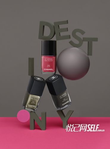 三种甲油色彩令指甲与整个系列完美呼应。甲油 #589 ÉLIXIR 灵药,粉色中透着淡淡的乳灰色调,散发出神秘莫测、柔和而又纯真无邪的诱惑。#591 ALCHIMIE 炼金术 的颜色充满活泼的吸引力,金属质感令卡其色与金色的结合更显特别。