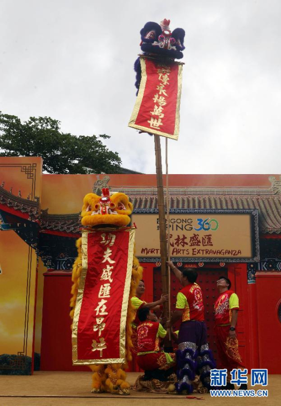 7月3日,演员在活动现场表演舞狮。当日,香港旅游景点昂坪360举行“武林盛汇”活动,邀请少林功夫大师重临香江,于昂坪市集为宾客尽展功夫。同时,为纪念一代功夫巨星李小龙逝世40周年,今年活动特别加入截拳道元素。“武林盛汇”活动将举办至9月1日。新华社发(王雨清 摄)